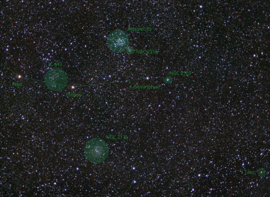 Unter Messier 35 zeichnet sich NGC 2158 als hell verfärbte Kugel ab. Eigentlich handelt es sich hierbei um einen offenen Sternhaufen, der aber nicht besonders gut aufgelöst ist und deswegen eher wie ein Kugelsternhaufen erscheint. Zu guter letzt findet sich noch NGC 2129, ebenfalls ein offener Sternhaufen, im Bild. Auch dieser ist nicht besonders gut aufgelöst und man muss schon wissen wo er sich befindet, um ihn zu sehen.